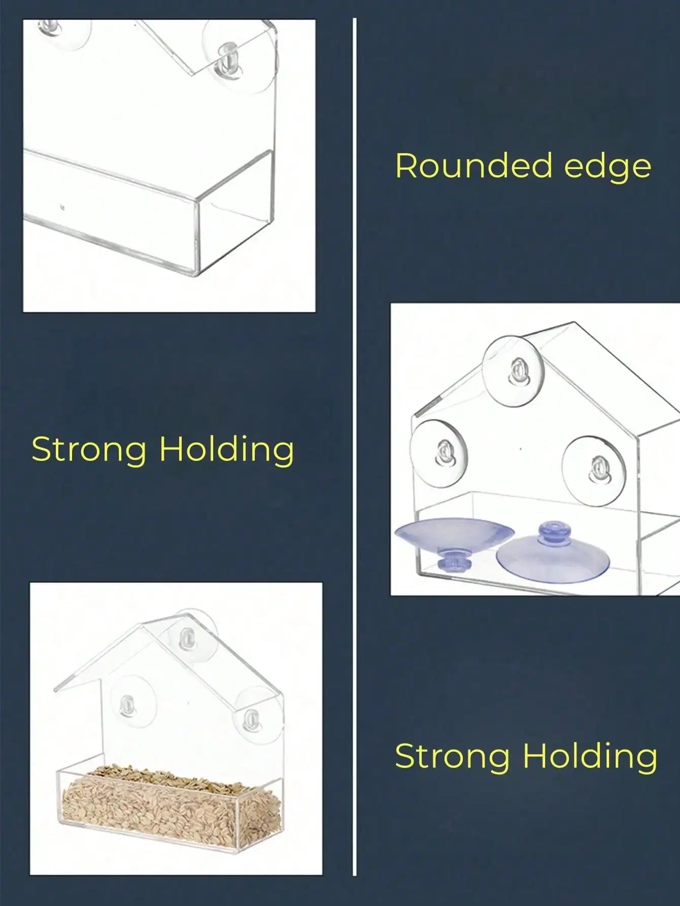 Acrylic Transparent Bird Feeder with Suction Cup This premium bird feeder combines crystal-clear acrylic construction with practical engineering to enhance your garden birdwatching experience. The transparent design allows unobstructed viewing of visiting birds whilst protecting seed from the elements. Engineered from high-quality acrylic with no concerning chemical additives, this feeder prioritises both bird safety and durability. The robust suction cup mounting system ensures secure attachment to windows or smooth surfaces, positioning your feeder for optimal observation. Ideal for attracting various bird species whilst maintaining a clean, minimalist aesthetic in your outdoor space. Perfect for both seasoned ornithologists and casual bird enthusiasts seeking reliable, long-lasting feeding solutions.